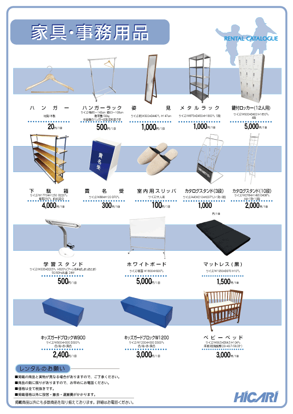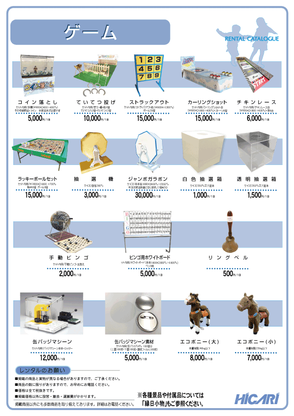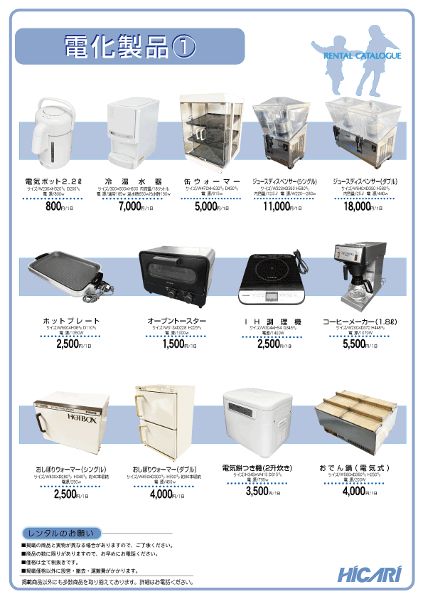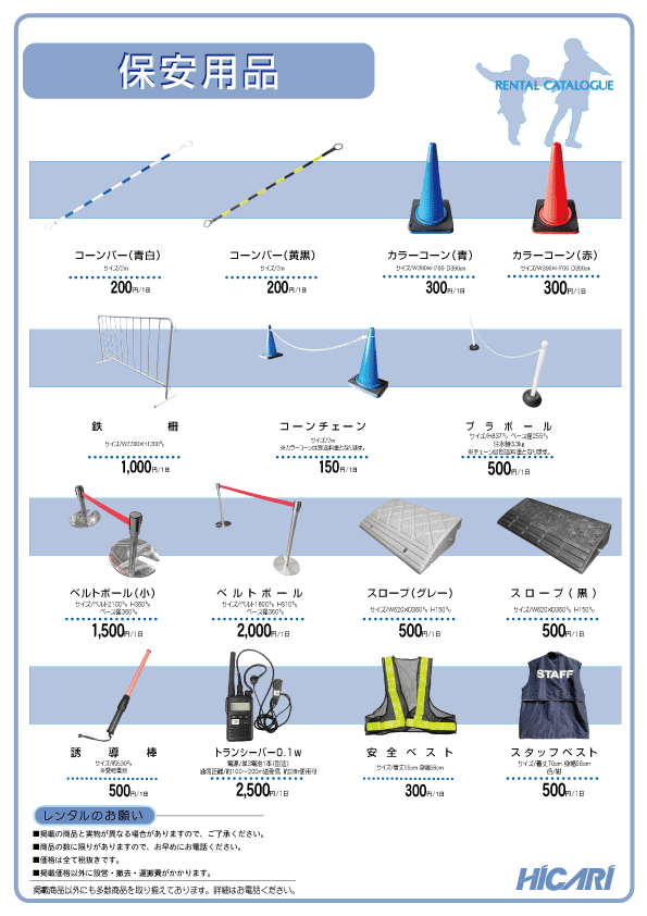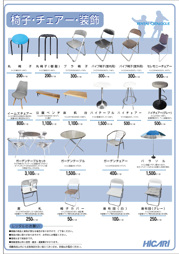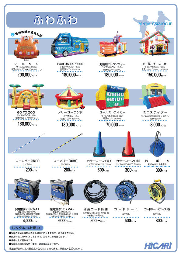 カタログ一覧 クリックすると目次が開きますレンタル商品カタログ一覧レンタルの流れキャンセル規約について運送会社による配送レンタルについてテント・横幕机・テーブル机・テーブル装飾椅子・チェアー神事用品式典・セレモニーステージ・やぐら会場装飾ゲームふわふわスポーツ縁日縁日小物調理器具調理雑貨容器・カトラリー電化製品冷暖房器具保冷・保温選挙用品家具・事務用品音響・映像照明衣装着ぐるみ看板・標示板看板制作・施工パネルその他保安用品養生レンタル商品カタログ一覧カタログに掲載していない商品もございますので、お気軽にお問い合わせください。まとめてご覧になる場合は こちら から レンタルの流れ ダウンロード キャンセル規約について ダウンロード 運送会社による配送レンタルについて ダウンロード テント・横幕 ダウンロード 机・テーブル ダウンロード 机・テーブル装飾 ダウンロード 椅子・チェアー ダウンロード 神事用品 ダウンロード 式典・セレモニー ダウンロード ステージ・やぐら ダウンロード 会場装飾 ダウンロード ゲーム ダウンロード ふわふわ ダウンロード スポーツ ダウンロード 縁日 ダウンロード 縁日小物 ダウンロード 調理器具 ダウンロード 調理雑貨 ダウンロード 容器・カトラリー ダウンロード 電化製品 ダウンロード 冷暖房器具 ダウンロード 保冷・保温 ダウンロード 選挙用品 ダウンロード 家具・事務用品 ダウンロード 音響・映像 ダウンロード 照明 ダウンロード 衣装 ダウンロード 着ぐるみ ダウンロード 看板・標示板 ダウンロード 看板制作・施工 ダウンロード パネル ダウンロード その他 ダウンロード 保安用品 ダウンロード 養生 ダウンロード
